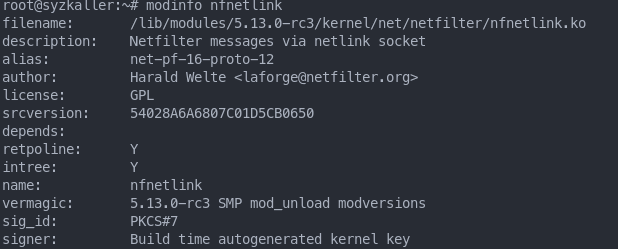 Whether you are fuzzing or looking into certain Linux subsystems, you might need to set up a loadable kernel module if you selected m option on kernel config. An example would be something like Netfilter which would load that module when you use them dynamically. If you do an lsmod you should be able to see some of loadable kernel modules like nfnetlink (Netfilter component). These aren’t automatically there when you follow this syzkaller guide. In this blog, we will compile kernel and setup Qemu image so that it can load these modules.